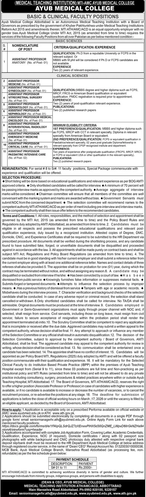 Ayub Medical College (MTI-AMC), Abbottabad, is seeking applications for numerous Basic and Clinical Faculty positions. The institution is hiring Assistant Professors across 11 different specialties. All appointments will be made purely on a contract basis, governed by the MTI Act 2015. Eligible candidates with relevant higher diplomas, PMDC registration, and clinical expertise are highly encouraged to apply.