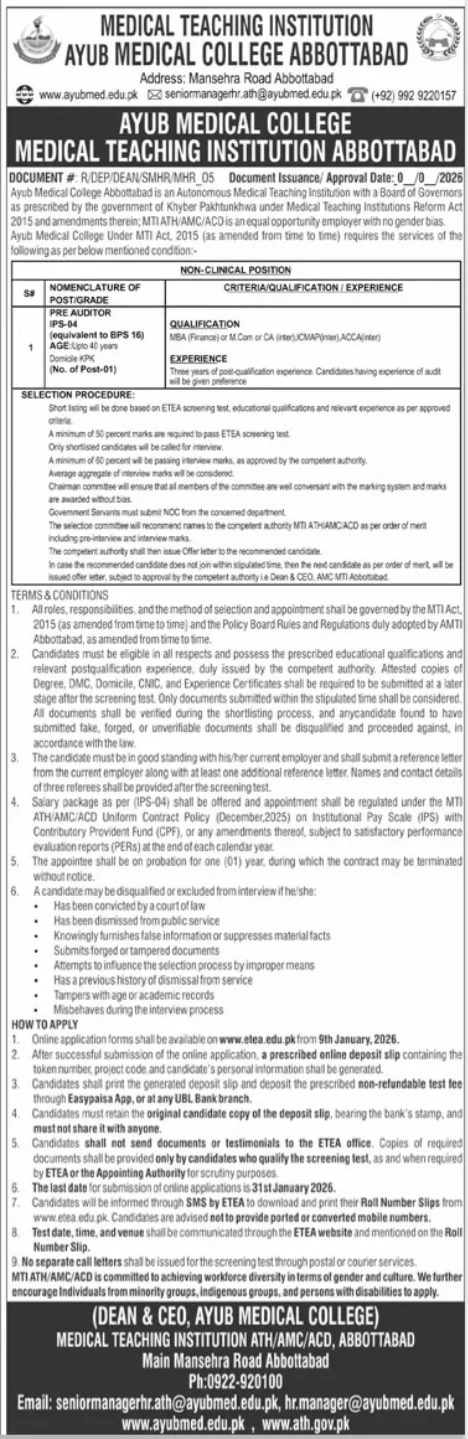 Medical Teaching Institution (MTI) Ayub Medical College Abbottabad has announced contract-based non-clinical job opportunities for qualified and experienced professionals. Applications are invited from eligible Pakistani nationals for appointment under the MTI Reforms Act, 2015. This is an excellent opportunity for finance and audit professionals to work in a prestigious medical teaching institution of Khyber Pakhtunkhwa.
