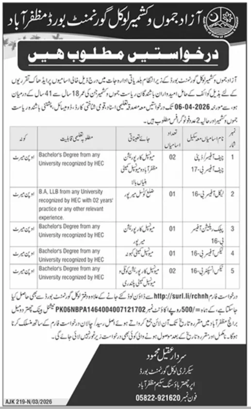 AJK Local Government Board is seeking a highly skilled and experienced Chief Inspector to join their team in Muzaffarabad. The successful candidate will be responsible for overseeing and managing various administrative tasks. The organization is offering a competitive salary package of 90,000 and a chance to work with a reputable government institution. The deadline for applications is April 6, 2026.