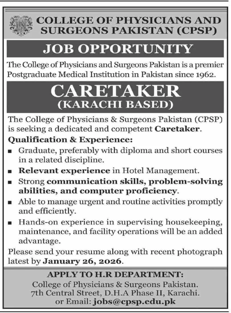 The College of Physicians and Surgeons Pakistan (CPSP) has announced a new career opportunity for qualified and experienced individuals for the position of Caretaker (Karachi Based). This is an excellent opportunity to work with Pakistan’s premier postgraduate medical institution.