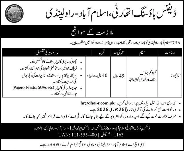 DHA Islamabad is seeking reliable candidates who are familiar with traffic rules and have a clean driving record. The selected candidates will be responsible for driving official vehicles and maintaining them properly.