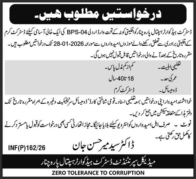 District Headquarter Hospital (DHQ) Parachinar has announced new contract-based government job opportunities for local candidates of Kurram District. Applications are invited for BPS-04 staff positions in the health department. This recruitment is a good opportunity for individuals seeking government jobs in Khyber Pakhtunkhwa with basic qualification.