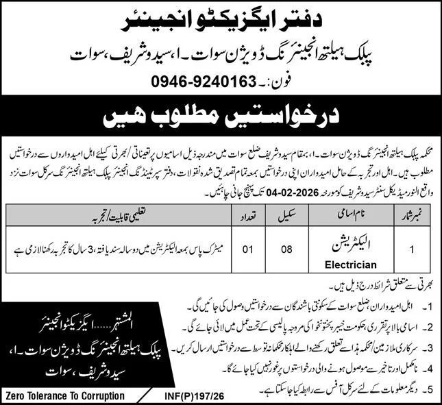 The Public Health Engineering Division Swat-I has announced a new vacancy for the year 2026. This is a government job opportunity for skilled individuals in Khyber Pakhtunkhwa (KPK) looking to serve in the public sector. The department is seeking a qualified Electrician (BPS-08) to join their technical team in Saidu Sharif, Swat.