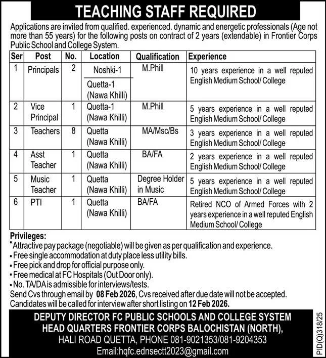 The Frontier Corps (FC) Public School and College System, under the Headquarters Frontier Corps Balochistan (North), has announced new career opportunities for 2026. The institution is seeking qualified, experienced, dynamic, and energetic professionals for teaching and administrative roles on a contract basis.