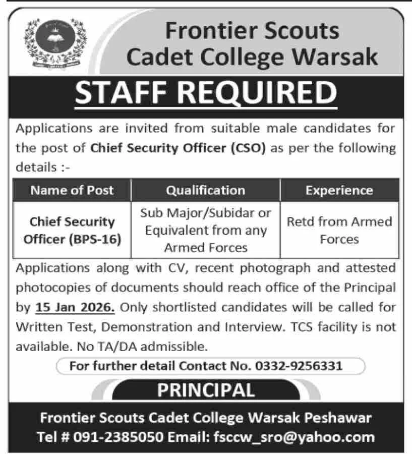 Frontier Scouts Cadet College Warsak Peshawar has announced a new government job opportunity for disciplined and experienced individuals. Applications are invited from suitable male candidates for appointment on contract basis against a senior security position. This is an excellent opportunity for retired armed forces personnel to continue serving in a reputable educational institution of Khyber Pakhtunkhwa.