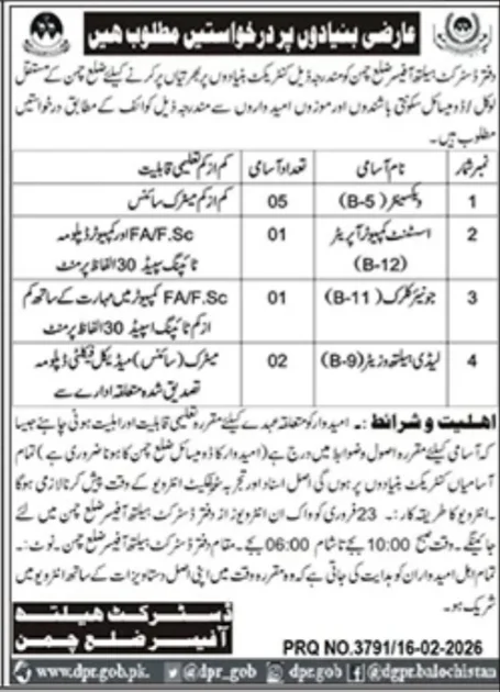 The District Health Office (DHO) Chaman has officially announced new career opportunities for the year 2026. These positions are being filled on a contract and temporary basis to support the healthcare infrastructure in District Chaman, Balochistan.