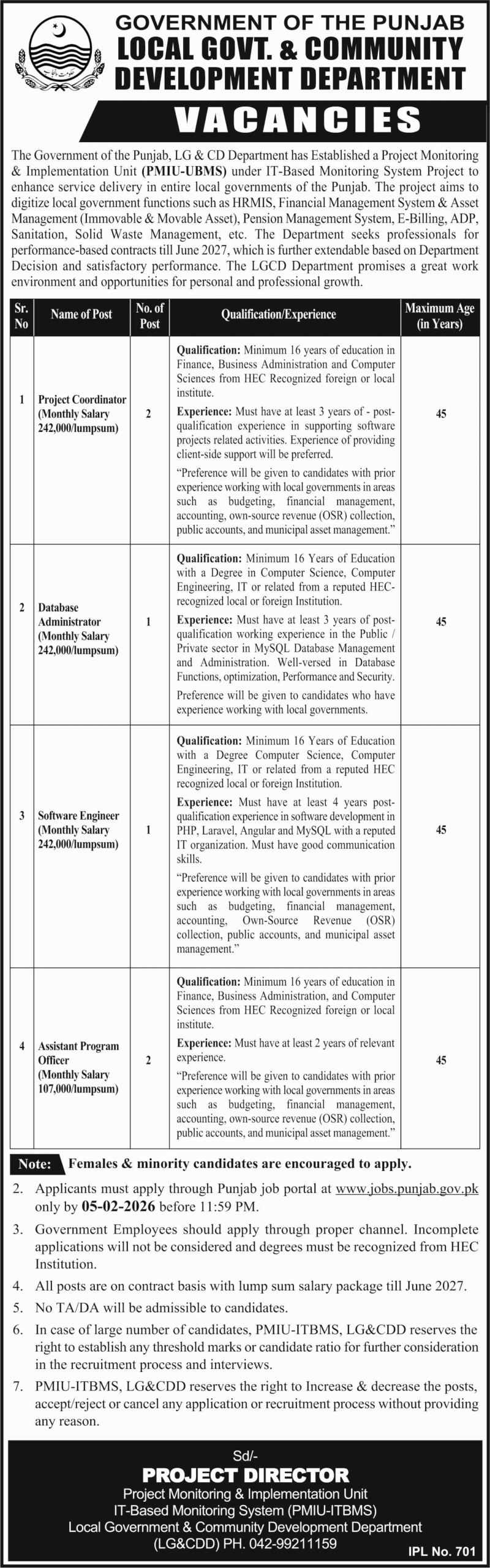 The Local Government & Community Development Department (LG&CDD), Government of the Punjab, has announced exciting career opportunities for the year 2026. The department has established a Project Monitoring & Implementation Unit (PMIU-ITBMS) to digitize local government functions. Applications are invited from dynamic, experienced, and qualified professionals for various contract-based positions.