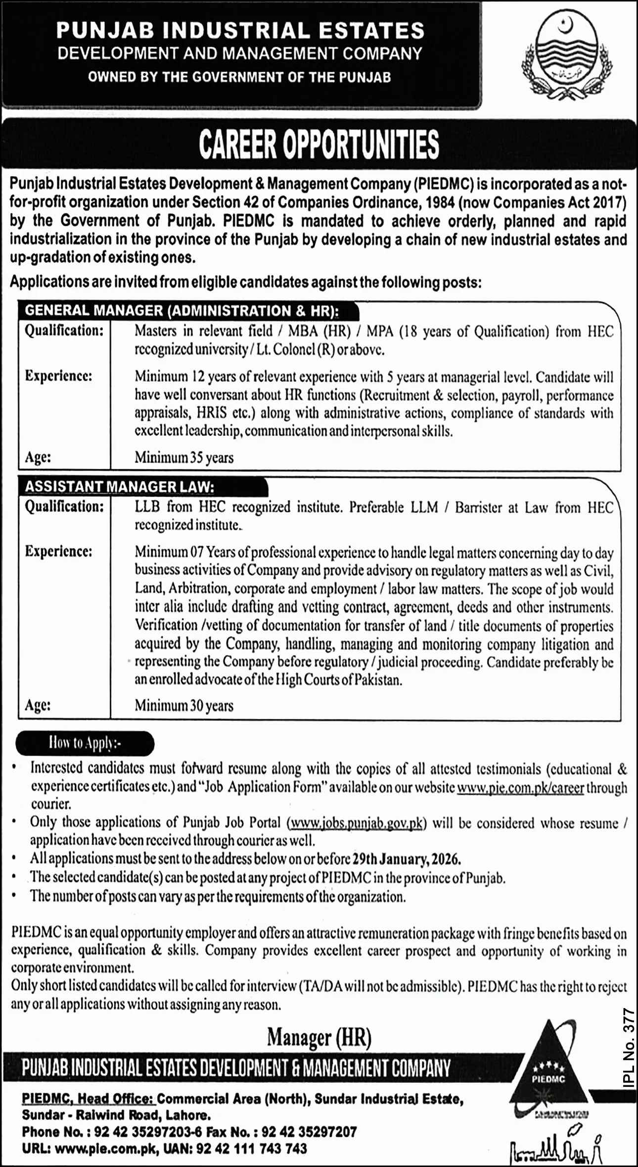 Punjab Industrial Estates Development & Management Company (PIEDMC), owned by the Government of Punjab, has announced career opportunities on a contract basis for highly qualified and experienced professionals. These vacancies are offered for senior management and legal positions at PIEDMC projects across Punjab.