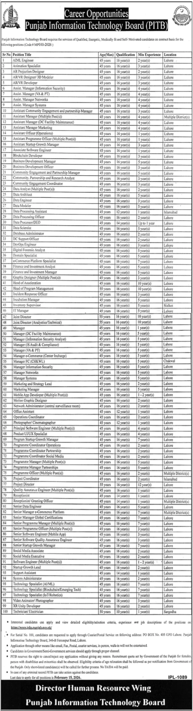 PITB is hiring for a wide range of roles. Below is a categorized list of the 100 advertised positions: