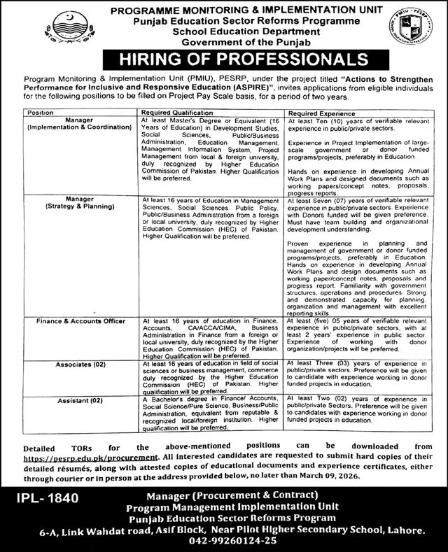 PMIU, under the project titled “Actions to Strengthen Performance for Inclusive and Responsive Education (ASPIRE)”, is urgently hiring for the position of Manager (Implementation & Coordination). This is a high-level, contract-based role designated for a period of two years. To align with optimal Google Search guidelines of focusing on a single job per page, this listing highlights the Implementation Manager role. It offers a rewarding career path for professionals with extensive public or private sector experience.