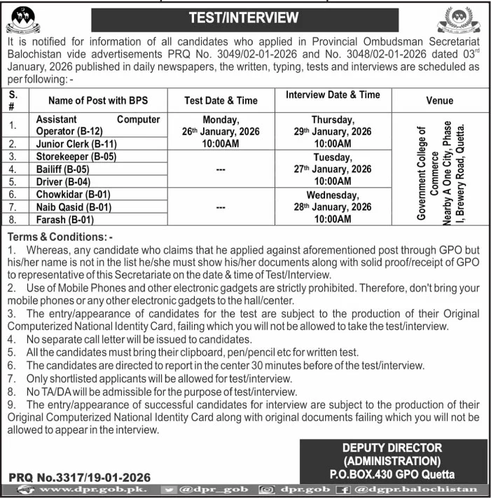 The Provincial Ombudsman Secretariat Balochistan has officially announced the Written Test and Interview Schedule for various vacant positions. This notification is for all candidates who applied for the posts advertised under PRQ No. 3049/02-01-2026 and No. 3048/02-01-2026 (dated 03 January, 2026).