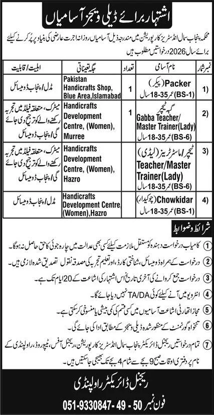 The Punjab Small Industries Corporation (PSIC) is currently accepting applications for various roles including Packer, Gabba Teacher/Master Trainer, and Chowkidar. These positions are distributed across different locations, including Islamabad, Murree, and Hazro. Hiring will be conducted purely on a temporary, daily wage basis for the year 2026. Candidates with a Punjab domicile are highly encouraged to apply.