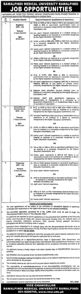 Rawalpindi Medical University (RMU) has announced high-level administrative career opportunities for the year 2026. Applications are invited from qualified Pakistani Nationals (having Punjab Domicile) for appointment on a Contract Basis (03 Years).