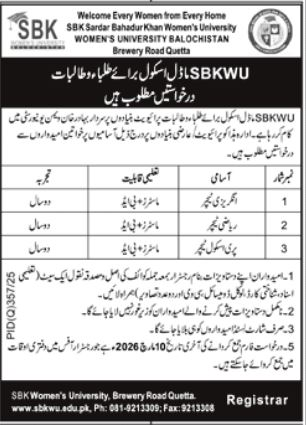 SBK Sardar Bahadur Khan Women’s University (SBKWU) Quetta has announced career opportunities through its Dale School program. The university is inviting applications from qualified and motivated women candidates across Balochistan for contractual positions in teaching and school management. These positions offer a meaningful opportunity to contribute to women’s education at a prestigious public sector university in Quetta.