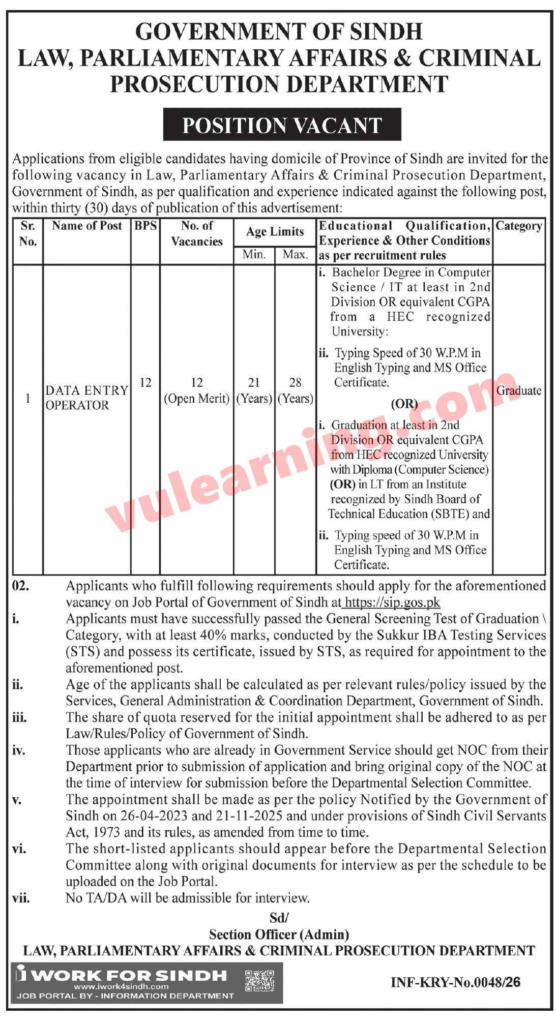 The Government of Sindh, Law, Parliamentary Affairs & Criminal Prosecution Department has announced new Data Entry Operator (BPS-12) vacancies for eligible candidates having Sindh domicile. These positions are offered under government recruitment rules and provide a stable career opportunity for graduates with computer and typing skills.