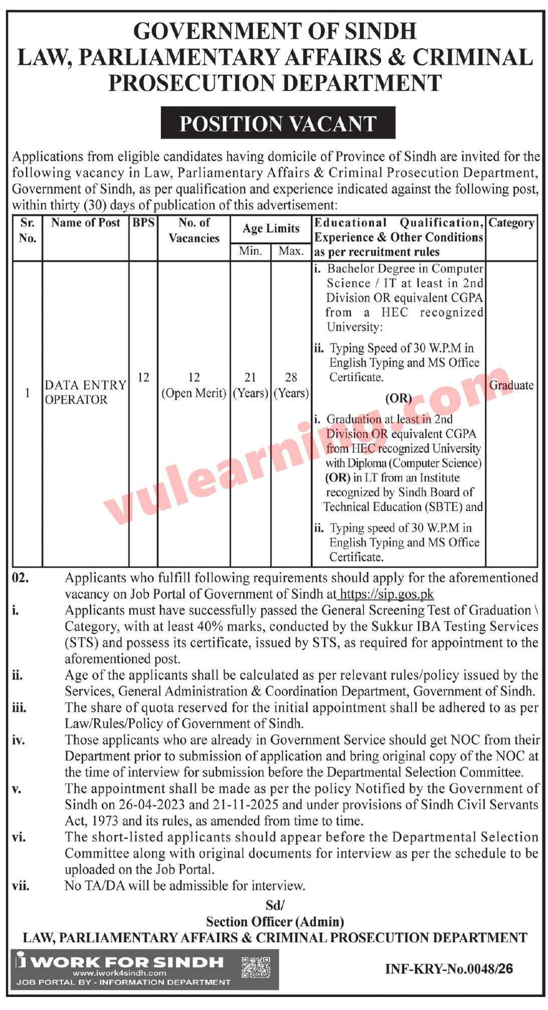 🏛️ Sindh Law Department Jobs 2026 – Data Entry Operator (BPS-12)