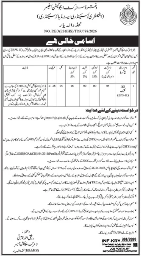 The Office of District Education Officer (Elementary & Secondary), Tando Allahyar, Sindh has announced contract vacancies for the post of Junior Clerk at BPS-11. Applications are invited from eligible and qualified candidates holding domicile of Tando Allahyar district. This is an excellent opportunity for qualified candidates to serve in the public education sector of Sindh. Interested candidates must apply online through the official Sindh Jobs Portal at sjobs.gos.pk before the last date of 15 March 2026.