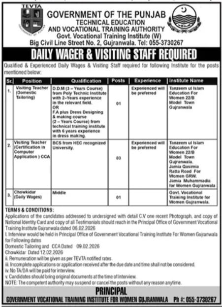The Government of the Punjab, through the Technical Education and Vocational Training Authority (TEVTA), has announced career opportunities for qualified and experienced individuals. The Government Vocational Training Institute (W), Gujranwala, is hiring staff on a Daily Wager & Visiting basis.