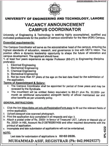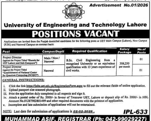 The University of Engineering and Technology (UET) Lahore has announced new administrative and technical career opportunities for the year 2026. Applications are invited from Punjab Domiciled candidates for the positions of Project Directors on a contract basis.