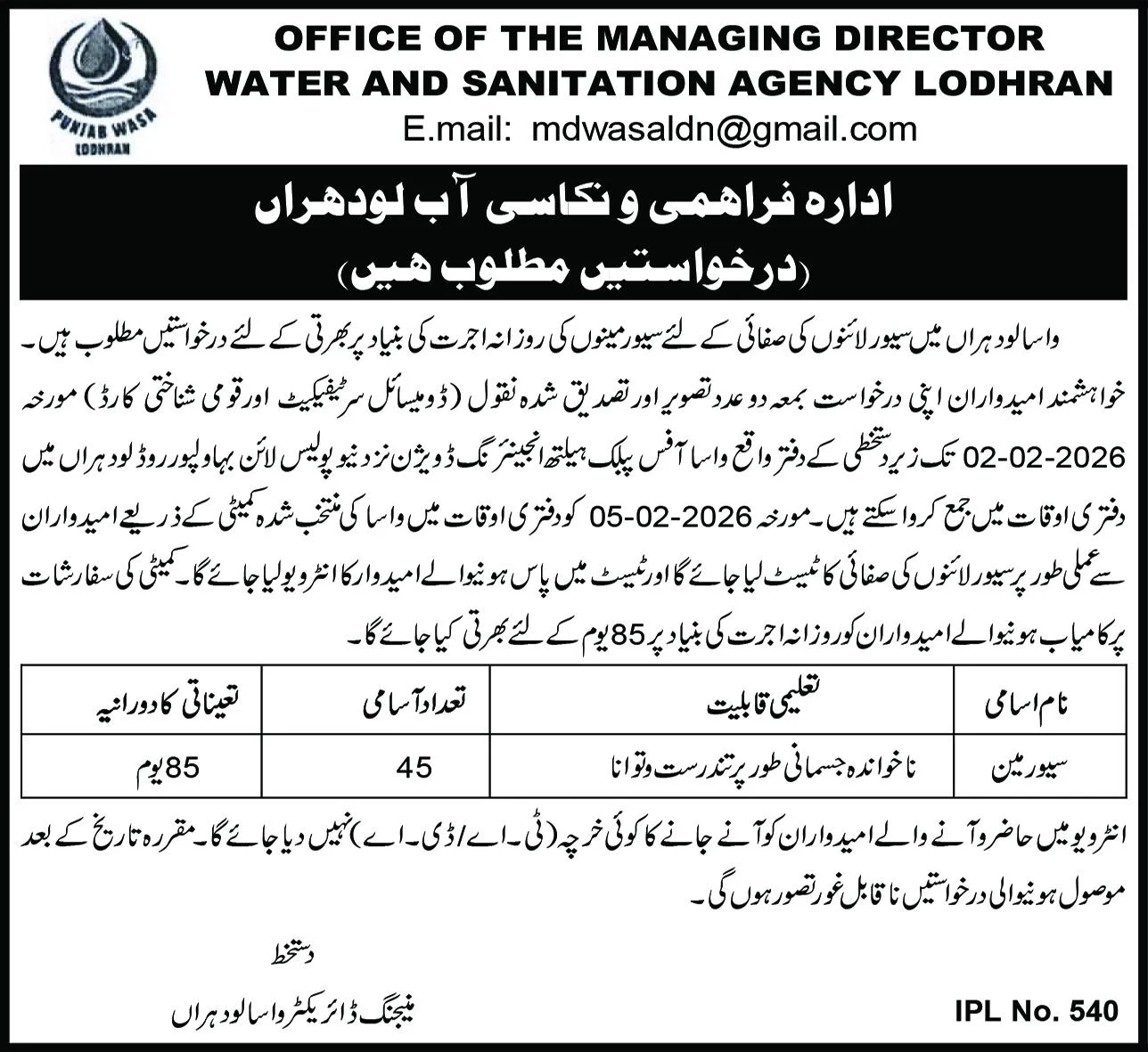 WASA Lodhran has announced vacancies for Sewermen to clean sewer lines on a daily wage basis (85 Days).